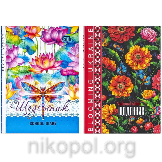 Шкільний щоденник формату А5 "Квітковий дизайн" в твердій обкладинці. На початку щоденника розташована сторінка для вказівки даних про ученицю (ПІБ, група крові, домашню адресу, електронну адресу, телефон) та місце для вклеювання фотографії. Також на початку присутні таблиці для запису ПІБ вчителів, однокласників з телефонами та адресами, розклад уроків. Наприкінці є таблиці з правилами правопису української мови, основними формулами та правилами алгебри, геометрії, хімії, фізики. Мова оформлення українська.Характеристики